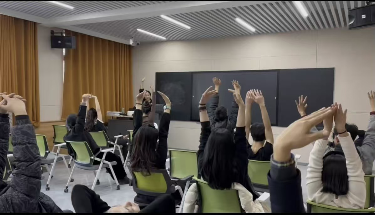 随后,在体验式教学的关键阶段,吴老师引领师生开展了一系列舞动治疗练习,亲身经历从身体行动的转变,到内在情绪状态的调整,再到认知模式的改变,直至人际互动方式产生微妙连锁反应的过程。这一过程使抽象的理论转变为可感知的身体体验。在“建立身心链接”的深度体验环节中,诸多师生在引导下,首次静心关注长期被学业和工作所忽视的身体感知,倾听来自身体内部的声音。此环节不仅促成了深刻的身心对话,更让参与者切实体会到通过身体活动实现情绪舒缓与内在平衡的实际成效,现场反应热烈,参与者感触颇深。
