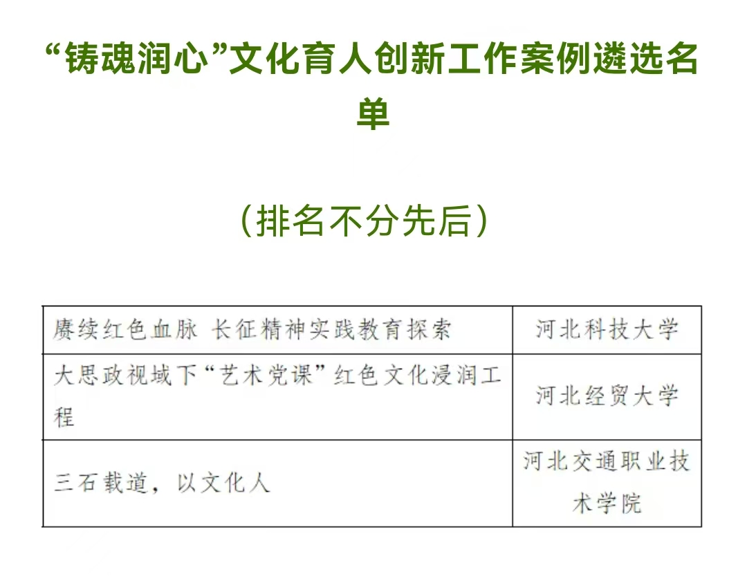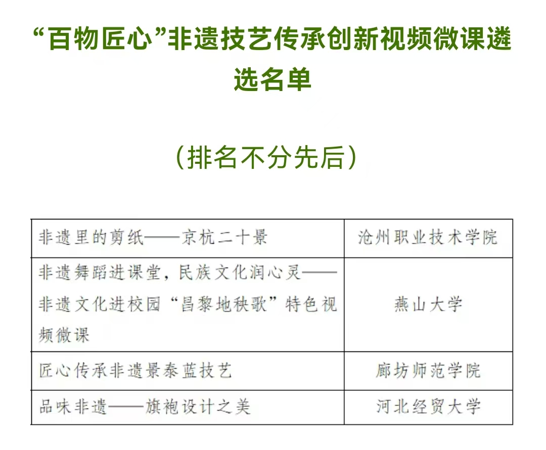 近日,教育部公布了2024年高校“礼敬中华优秀传统文化”宣传教育活动评选结果,共计遴选出“创承文脉”高校主题数字微展览联展作品51件、“铸魂润心”文化育人创新工作案例100件、“百物匠心”非遗技艺传承创新视频微课100件。其中,由我院报送的作品《大思政视域下“艺术党课”红色文化浸润工程》入选“铸魂润心”文化育人创新工作案例遴选名单,《品味非遗——旗袍设计之美》入选“百物匠心”非遗技艺传承创新视频微课遴选名单。